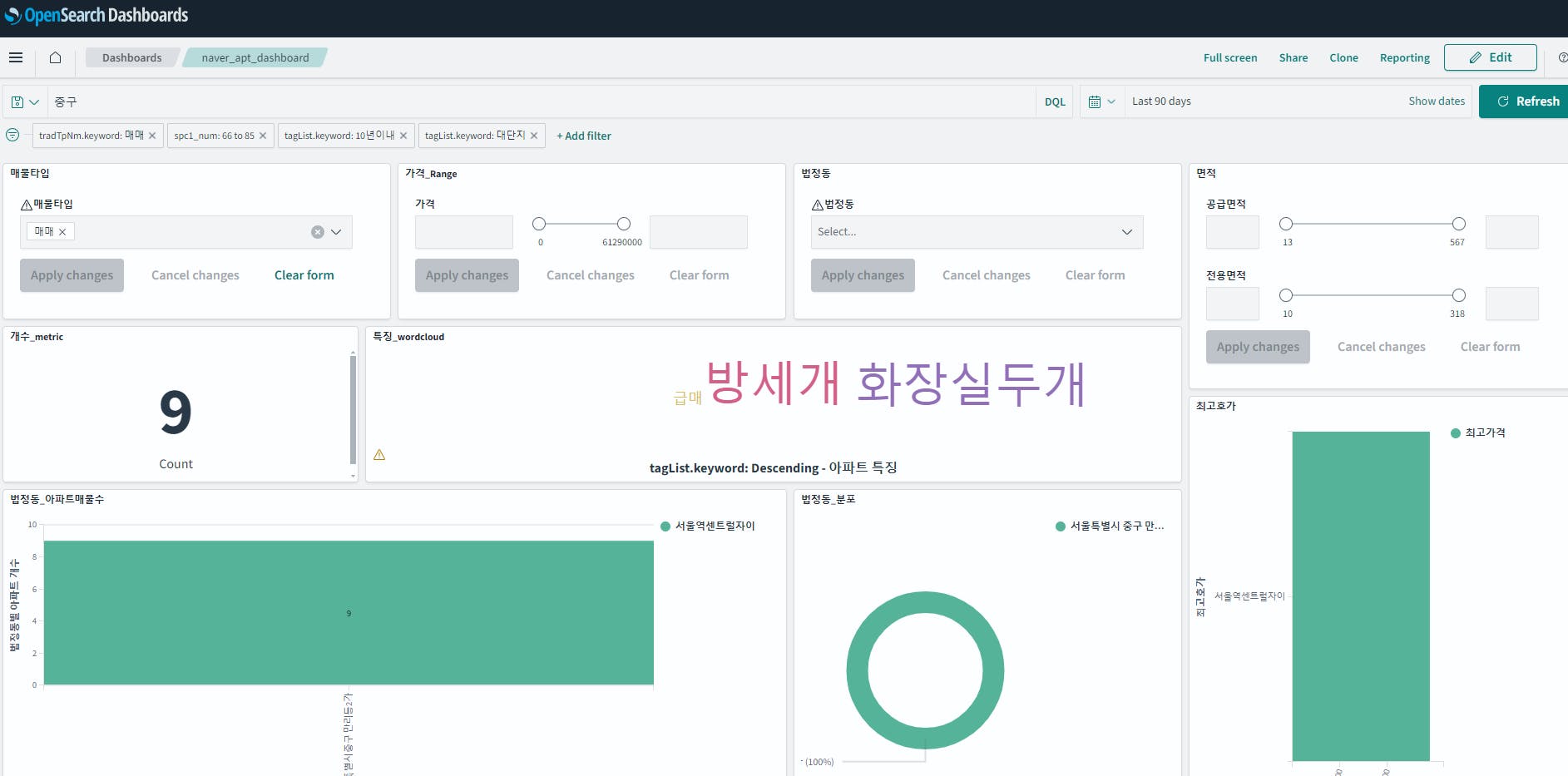 케빈님의 대시보드에 중구를 넣어봅니다. 보다 자세한 필터링을 위해 쿼리를 넣고 싶지만 쿼리 방법도 가물가물하고 필드 제목들이 뭔지 잘 모르겠어서;; 면적 범위만 살짝 바꾸고 넣어본 결과