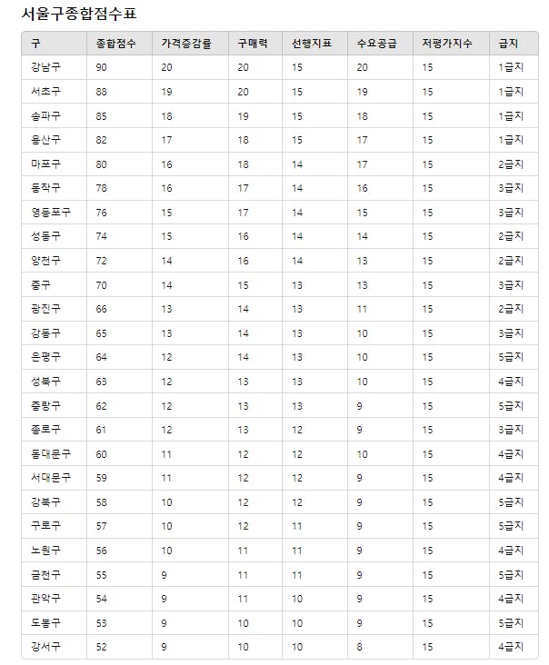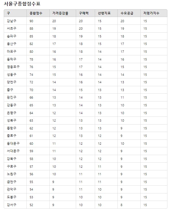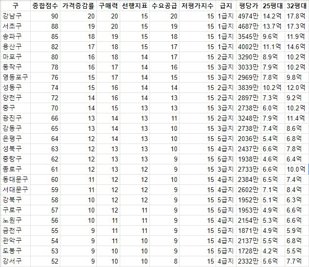그럼 이 구별로 점수나 등급은 높은데 가격이 낮은곳이 있을까 싶어 구별 매매가를 추가합니다. 2020년 데이터라고는 하지만 정리가 잘 된것 같아서 http://buking.kr/rank.php?m=mg&st=md&gi=1&si=%EC%84%9C%EC%9A%B8 결과를 사용했습니다. 공공데이터를 취합해서 넣으면 더 좋겠습니다만 이것도 시간관계상 일단 좀 간단하게 복붙으로 ^^;;;;