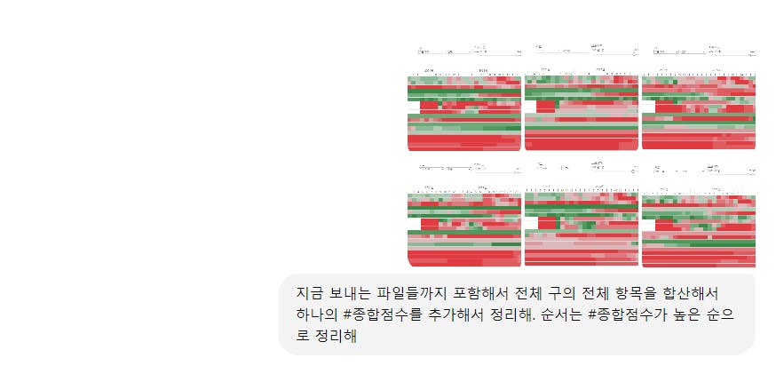 다음은 내용을 표로 정리해달라고 했습니다. 종합점수가 높은 순으로 정렬해서 색깔로 구분해 달라고 했는데 이런 식으로 하더군요