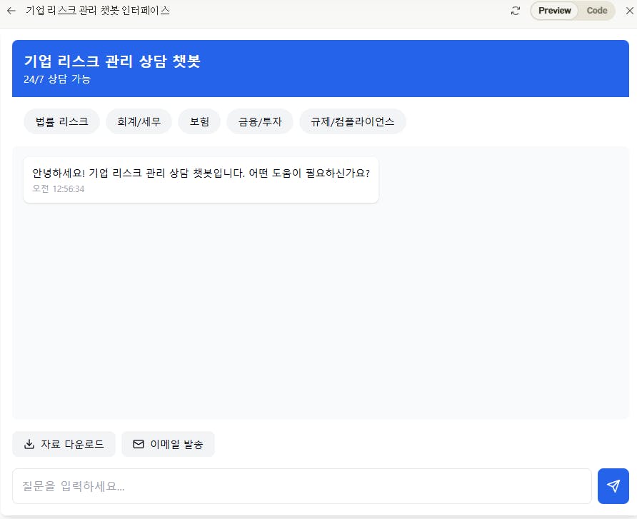 content: '안녕하세요! 기업 리스크 관리 상담 챗봇입니다. 어떤 도움이 필요하신가요?',