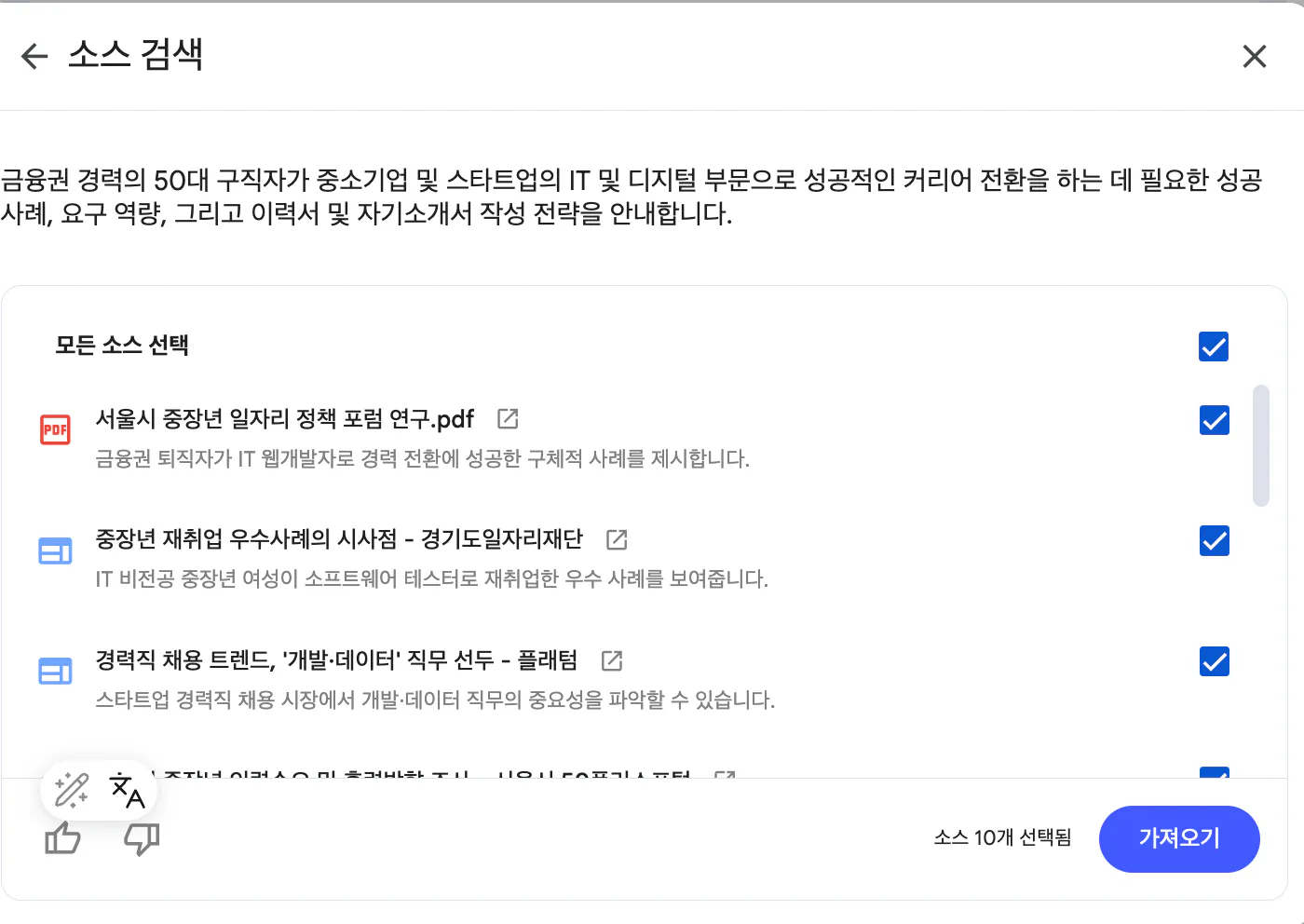 ‘금융권 경력의 50대 구직자’가 [기업 유형: 중소기업/스타트업]의 [IT 및 디지털] 부문으로 커리어를 전환하려고 합니다. 1. 2023년 이후 이 분야에서 중장년 커리어 전환에 성공한 사례(이력서/경력기술서/자기소개서의 특징, 공통점, 강조한 역량)를 조사해 요약해 주세요. 2. 해당 기업(혹은 업계)에서 최근 중장년 경력자의 채용에서 중점적으로 보는 역량, 경험, 키워드를 표로 정리해 주세요. 3. 위 내용과 중장년 경력자의 강점(예: 리더십, 프로젝트 관리, 대인관계, 풍부한 실무 경험 등)이 잘 드러나도록 이력서나 자기소개서 작성에 활용할 수 있는 문장 예시 또는 가이드라인을 제시해 주세요.검색된 소스를 '가져오기'합니다. NotebookLM 무료 버전은 소스를 50개까지 추가할 수 있으니 몇 번 더 소스를 검색하여 소스를 가져옵니다.