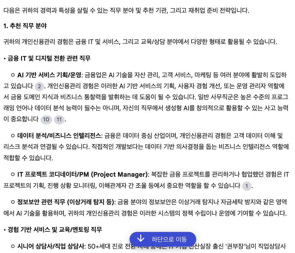 나의 경력사항, 자격사항, 교육수료 내역을 정리해서 던져주고 적합한 직무를 추천해 달라고 합니다.
