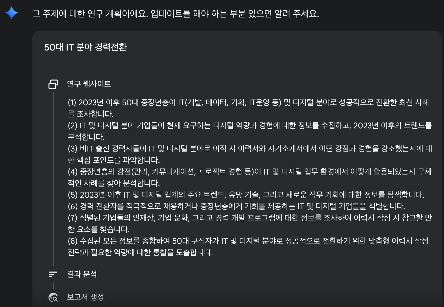 1. Gemini에 지원분야에 대한 보고서를 요청하는 프롬프트를 입력합니다.