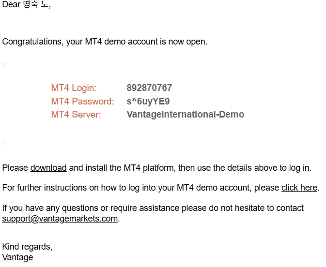 vantage : 데모계좌, MT4, RAW ecn, USD, 500:1, 25000과 10000선택하여 계좌개설함