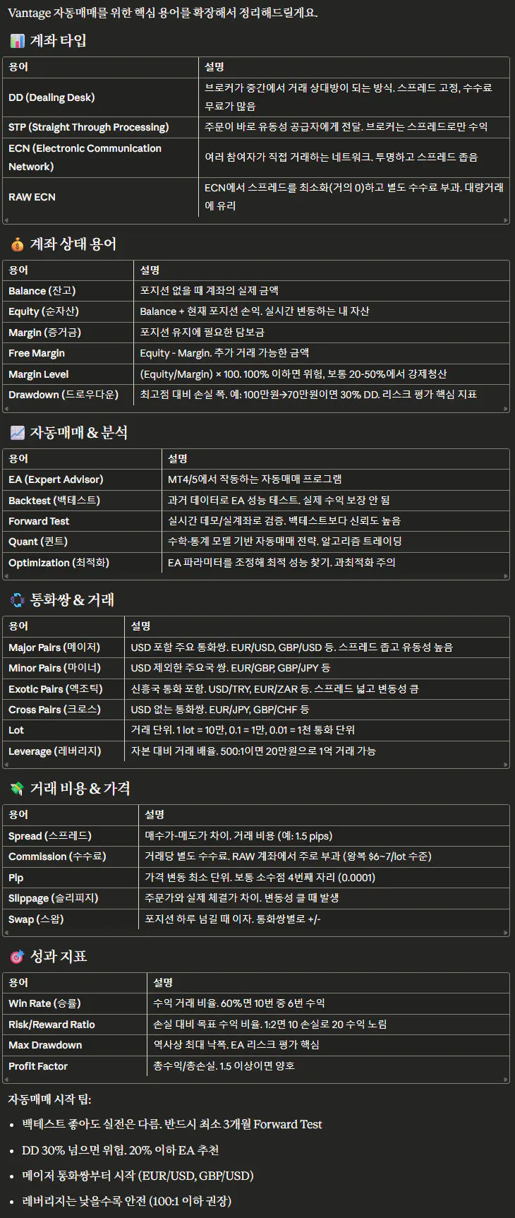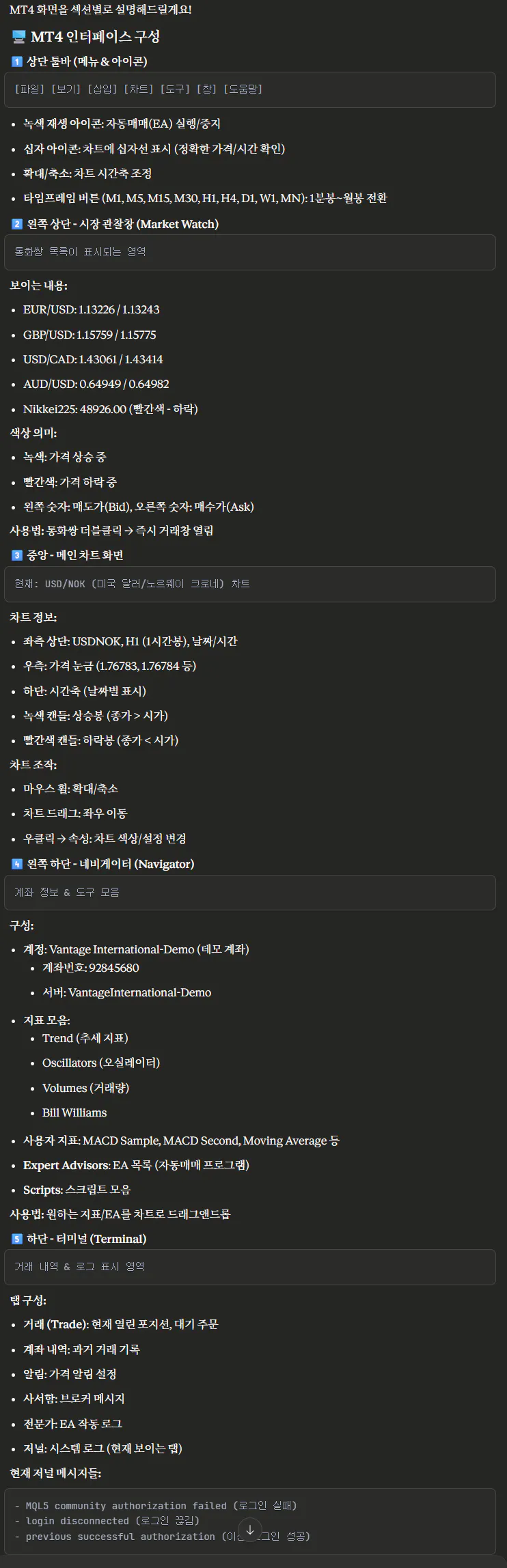 • 생소한 용어들(MT4, EA, 백테스트, 익스퍼트 어드바이저 등)을 Claude에게 하나하나 물어보며 정리