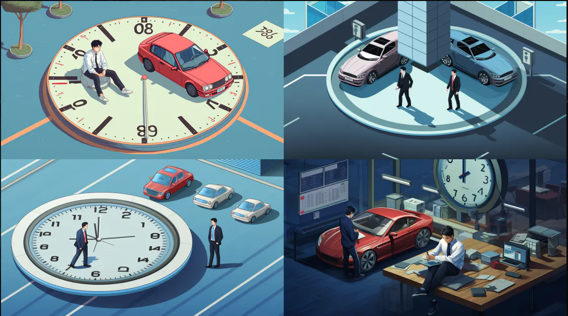 • Two Korean men working in finance. One is driving ahead in a car and the clock behind him shows seconds, the other is running and the clock behind him shows 60 minutes full], 8K, isometric, by canon eos --ar 16:9
