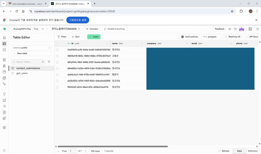 그 결과 아래와 같이 홈페이지에 문의를 남긴 분들의 데이터가 Supabase Table에 잘 저장됩니다