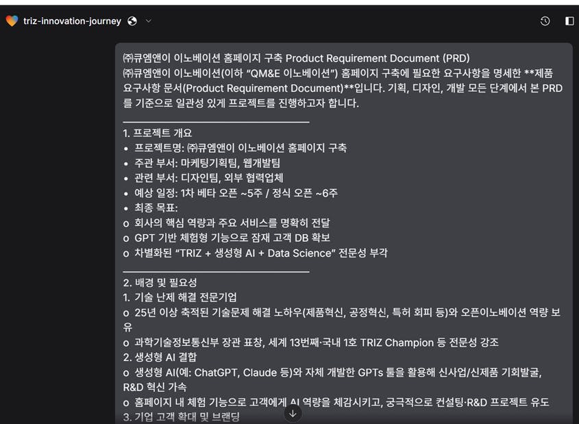 이전에 만든 큐엠앤이이노베이션 홈페이지 구축 Product Requirement Document(PRD) 문서내용 입력