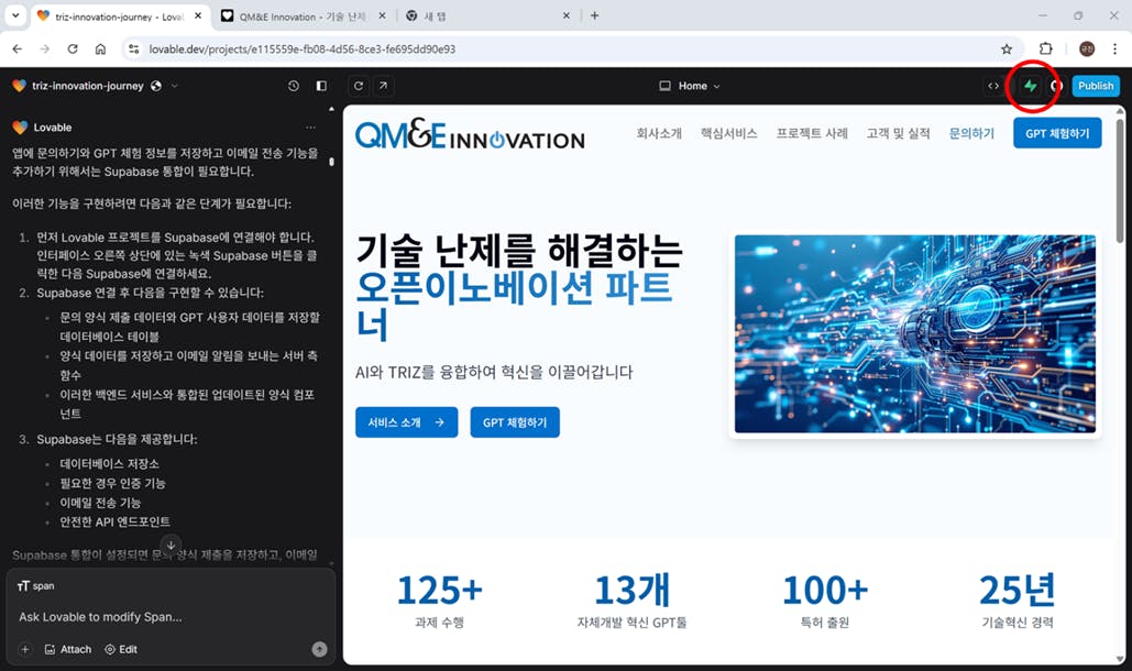 고객문의 데이터나 GPT체험자 데이터를 DB화하기 위해 백엔드 구축이 필요하는 이 기능은 lovable과 잘 연동되는 Supabase를 활용하면 됩니다. Supabase는 오픈소스기반의 Backend서비스 제공 플랫폼이라고 하네요.