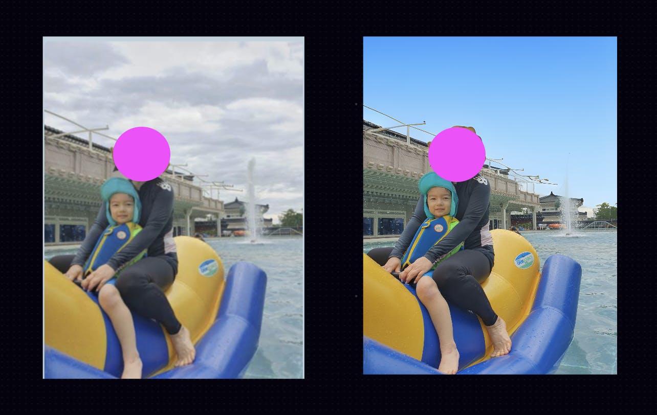 5)여행가서 찍은 가족사진의 흐린 하늘도 맑은 하늘로 바꿔주고,