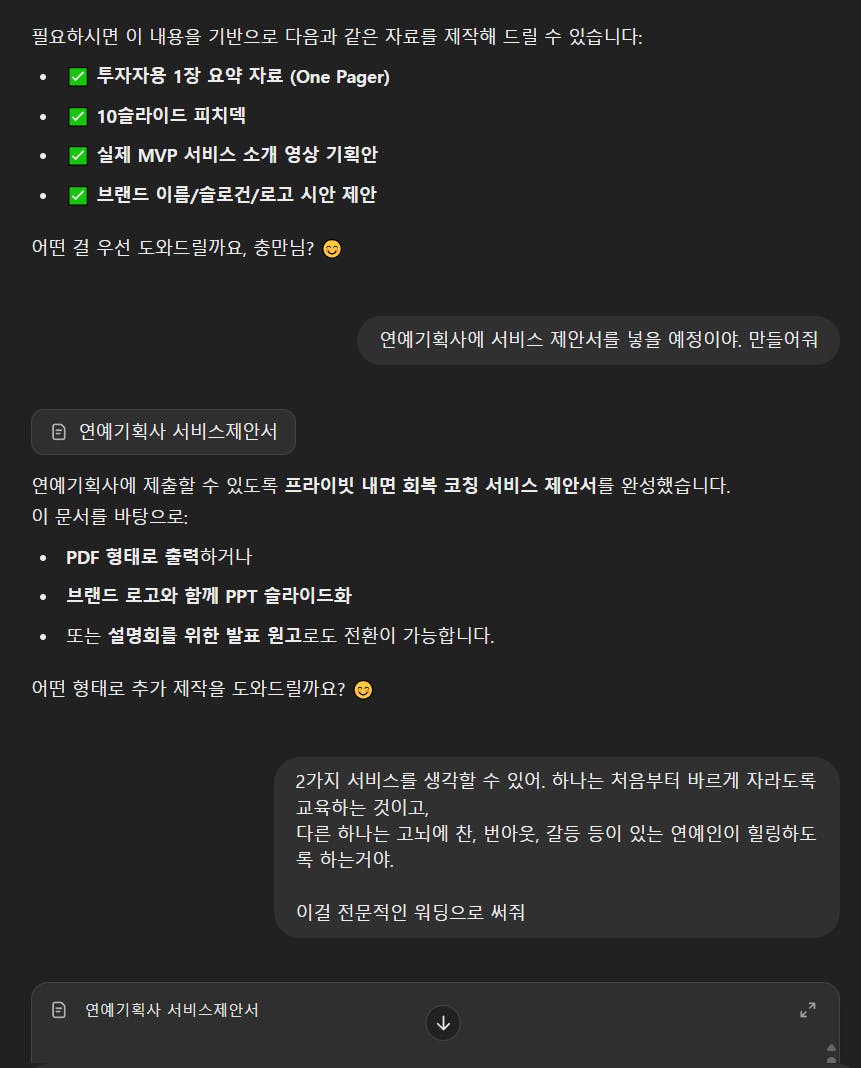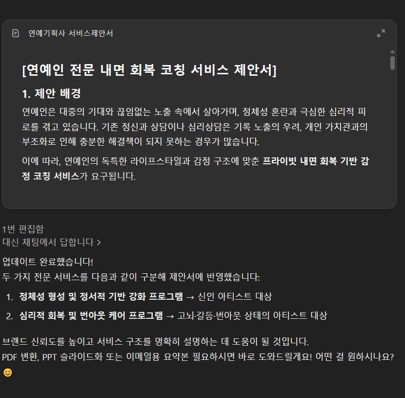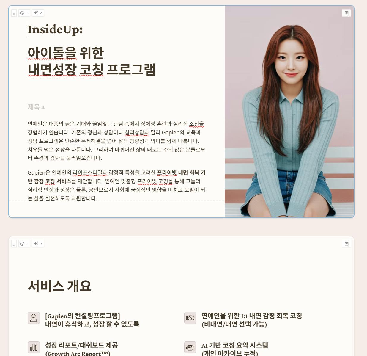 그러다 지난주에는 미래소년 년님과 토론하며 '표본이 되는 그룹'으로 좁히는 제안을 받아 CEO를 향한 명상코칭 제품을 론칭해서 후다닥 상세페이지를 만들고 CEO분들에게 무료코칭을 제안하는 접근을 했었습니다. 그리고 이번에는 김예승, 여행가K 님과 토론하며, 최근 뉴스에서 본 안타까운 사연을 접하고, 어린나이에 높은 대중의 관심으로 심리적 소진을 경험하는 "아이돌을 위한 내면성장 코칭 프로그램"을 제안서를 작성하기로 합니다. 다들 타켓과 상품기획이 분명하다며 기뻐합니다.