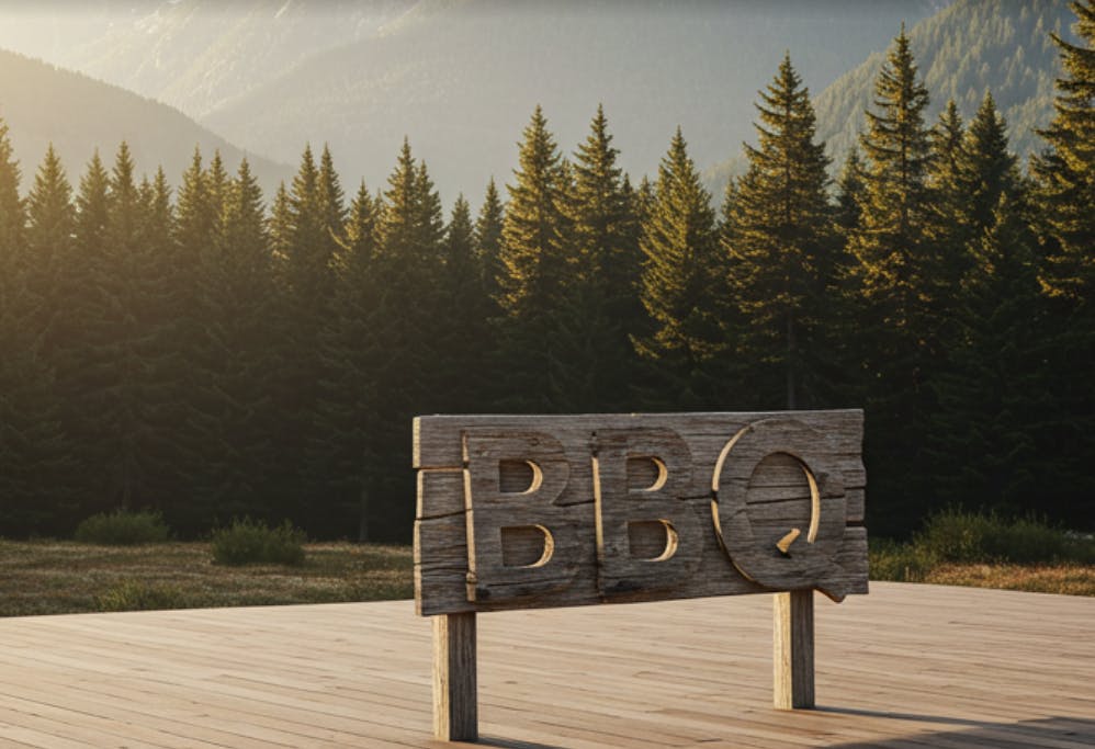 bare outdoor wooden deck with placeholder sign "BBQ", surrounded by mountain in background, sunlight filtering through trees — conceptual image for a future barbecue area
