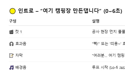 위와 같은 6개의 씬으로 이루어진 구성을 제시해줬어요