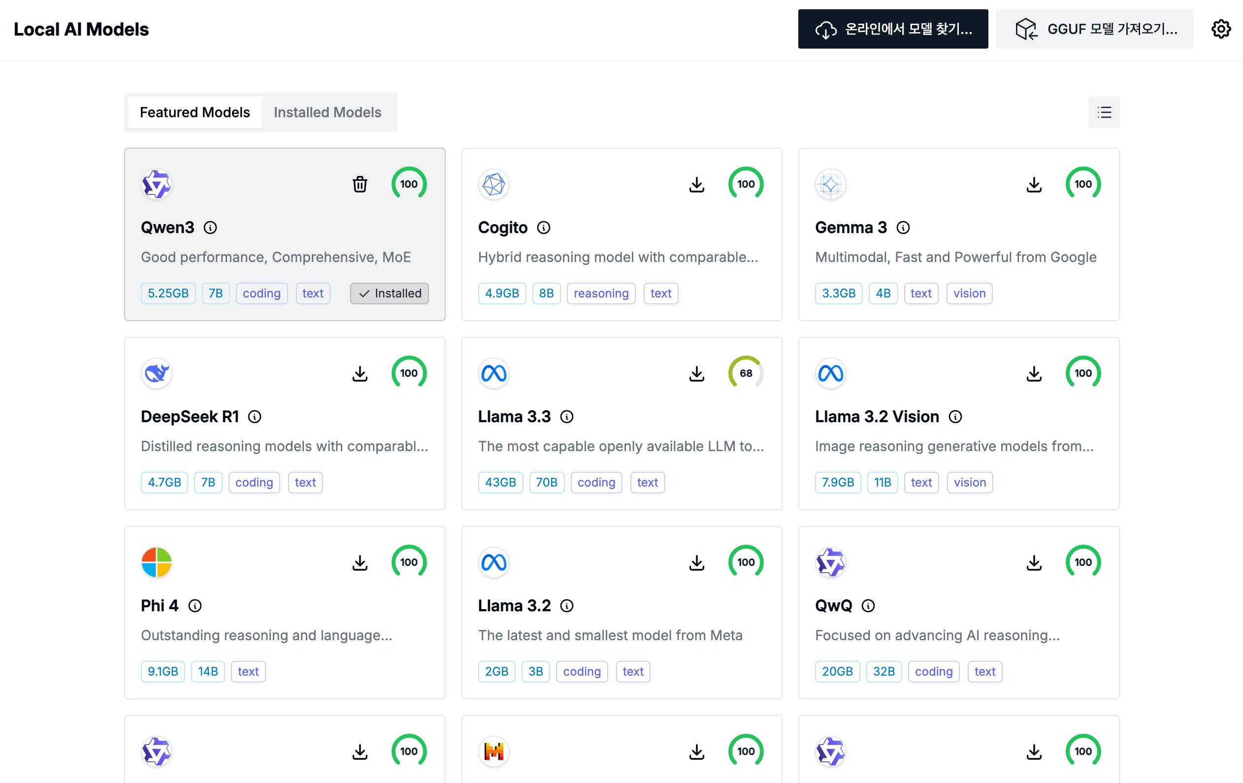 먼저 로컬 llm은 msty를 깔아서 모델 골라서 다운 받으면 됩니다. 허깅페이스 올라마에 그냥 바로 연결되어서 내 맘대로 모델을 골라서 써볼 수가 있습니다.