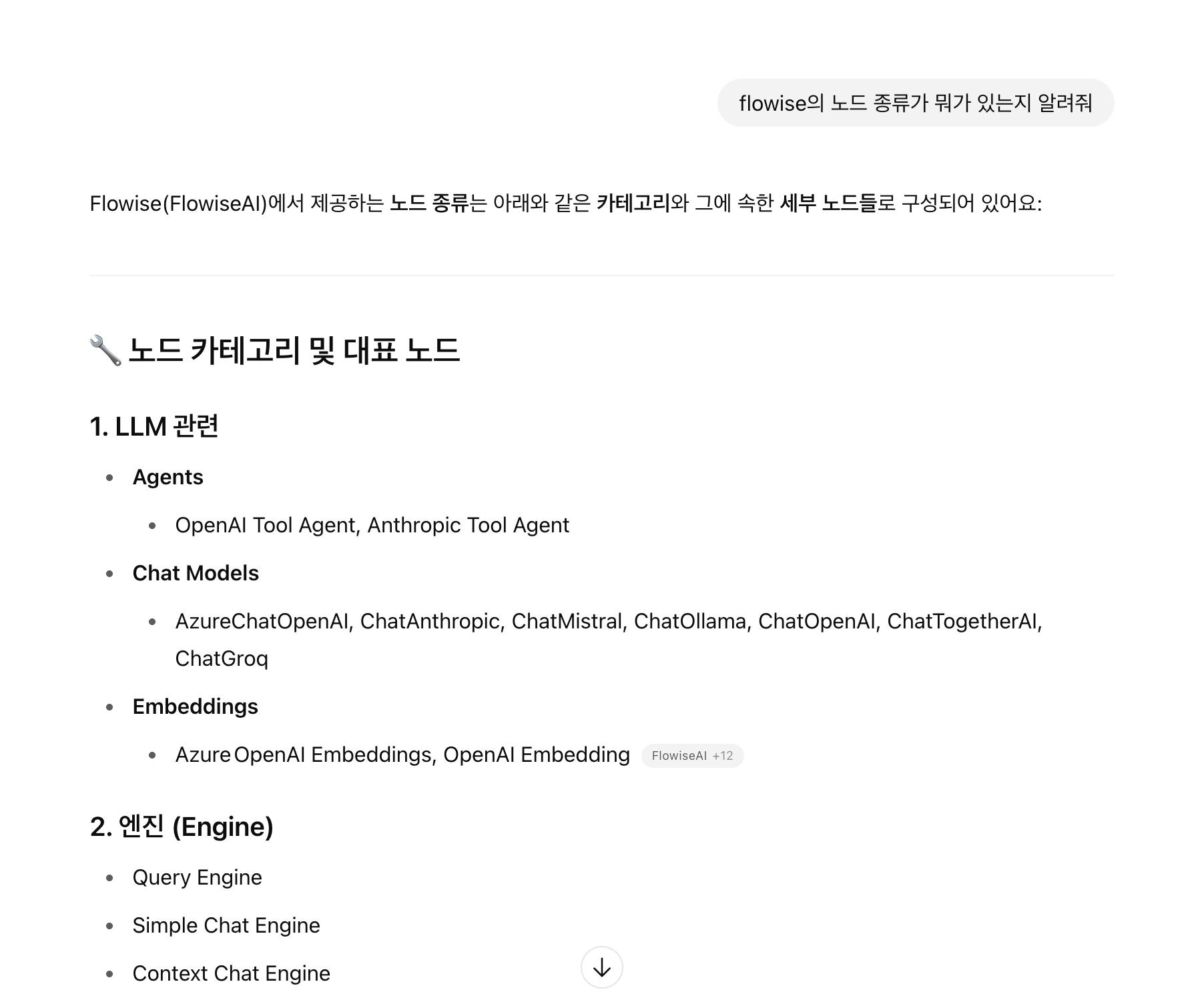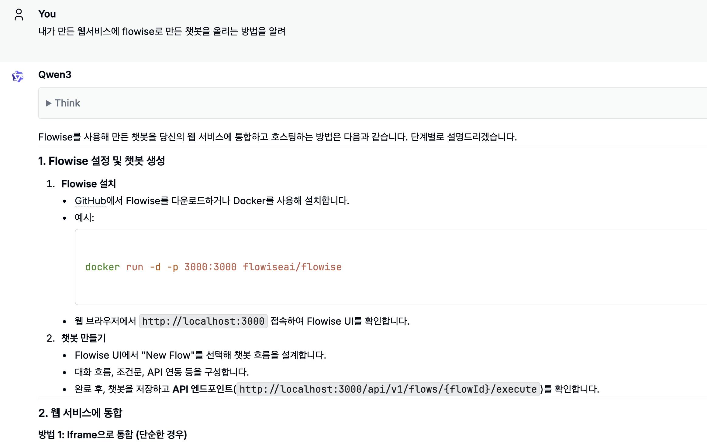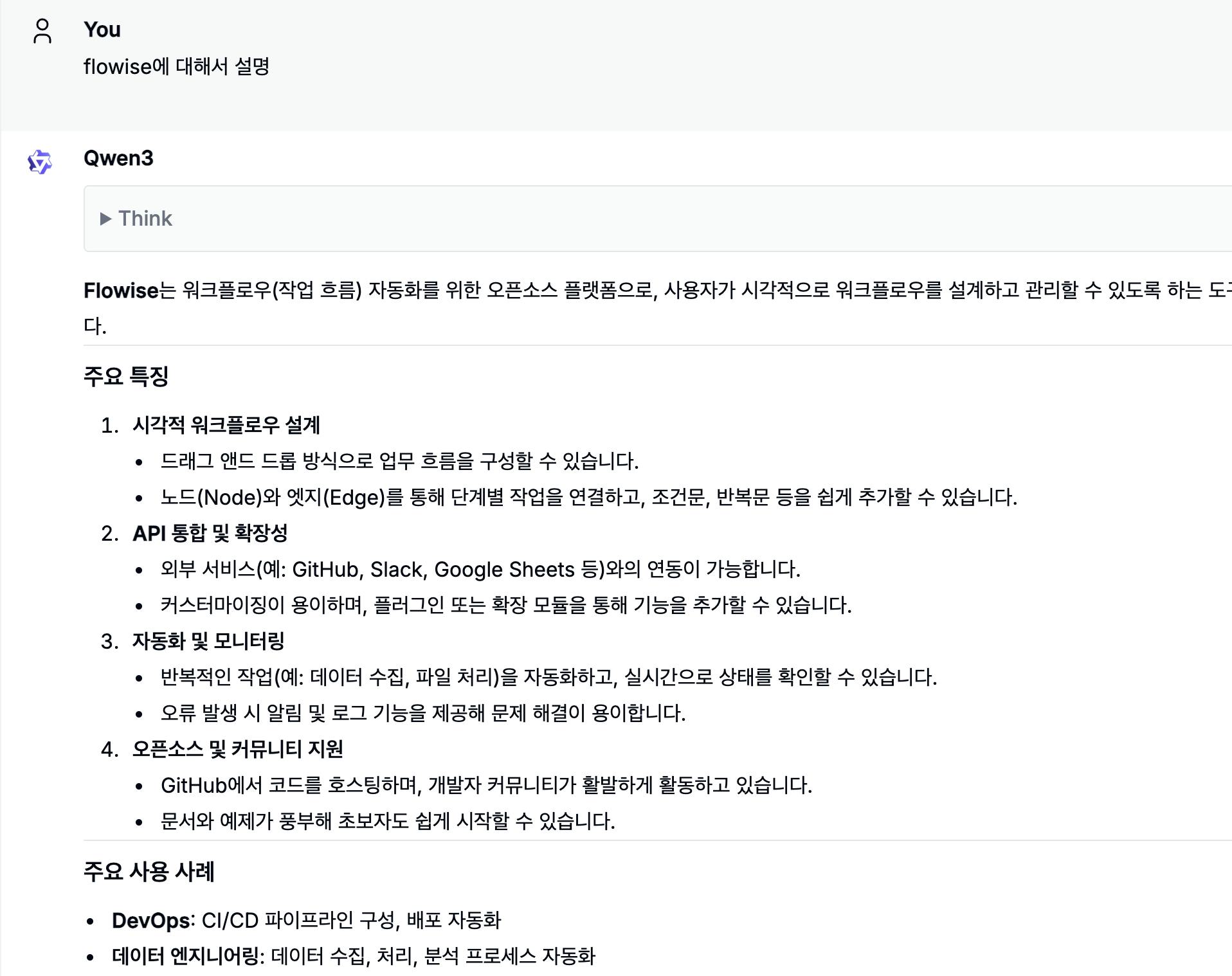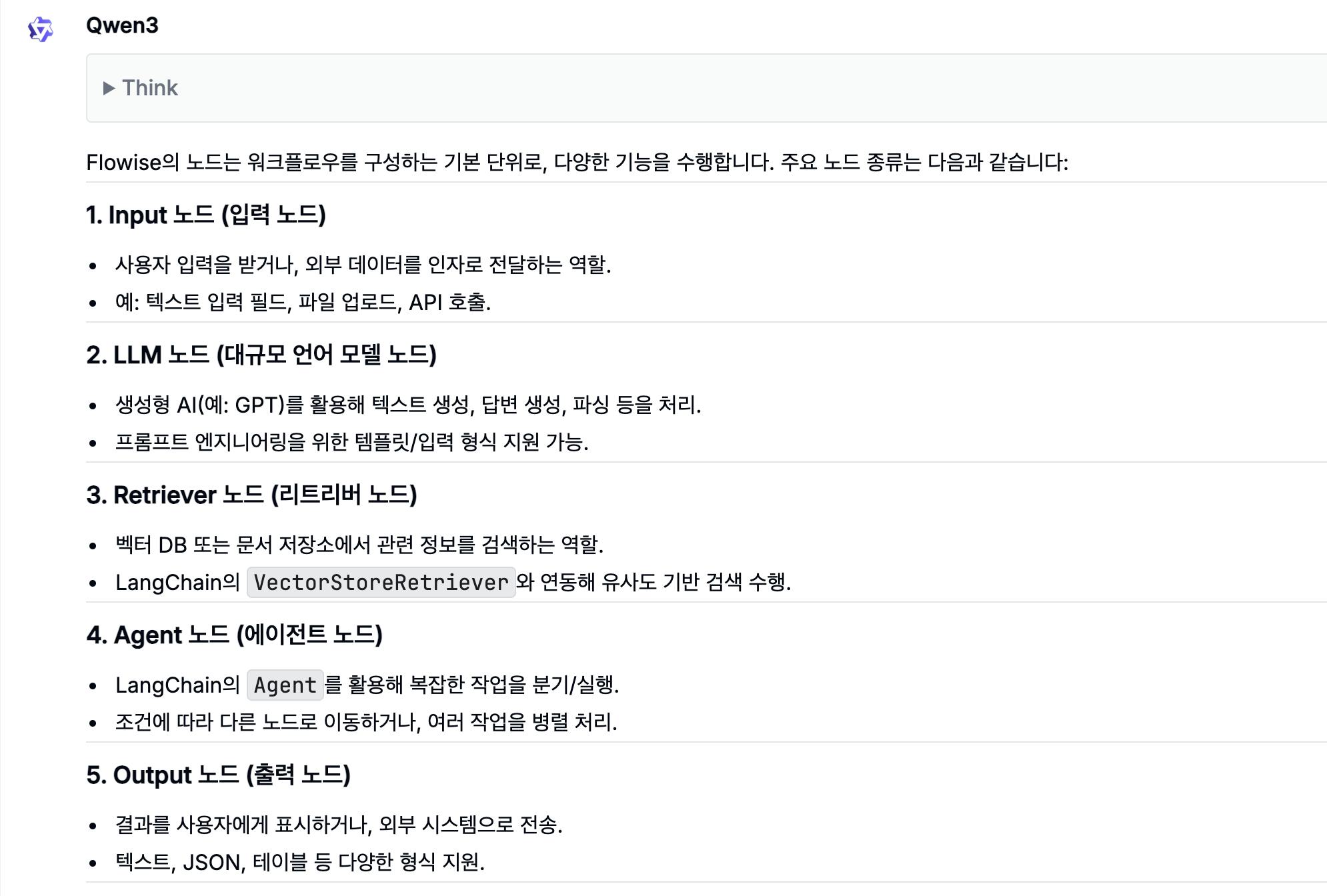 이제 완성된 rag기반 flowise질문 답변 전용 로컬 llm이 완성되었습니다. 여기에 하나씩 질문해가면서 flowise를 설정해갑니다.