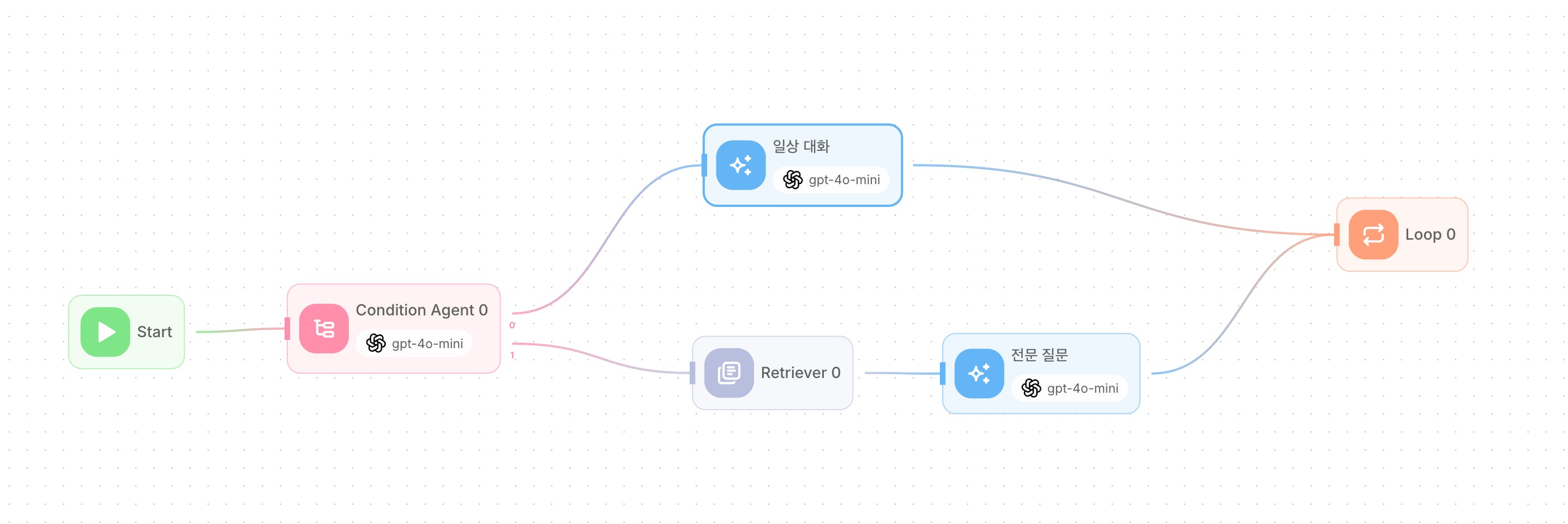 이런 시나리오로 접근했습니다. 유저가 챗봇으로 질문을 하면 친근하고 일상적인 답변도 잘 대응을 해주는데, flowise에 대한 아주 정확하고 상세한 질문을 한다면 rag 기반 문서를 검색한 뒤에 그걸 바탕으로 답변을 출력하게 하는 아주 간단한 노드로 구성을 해봤습니다.