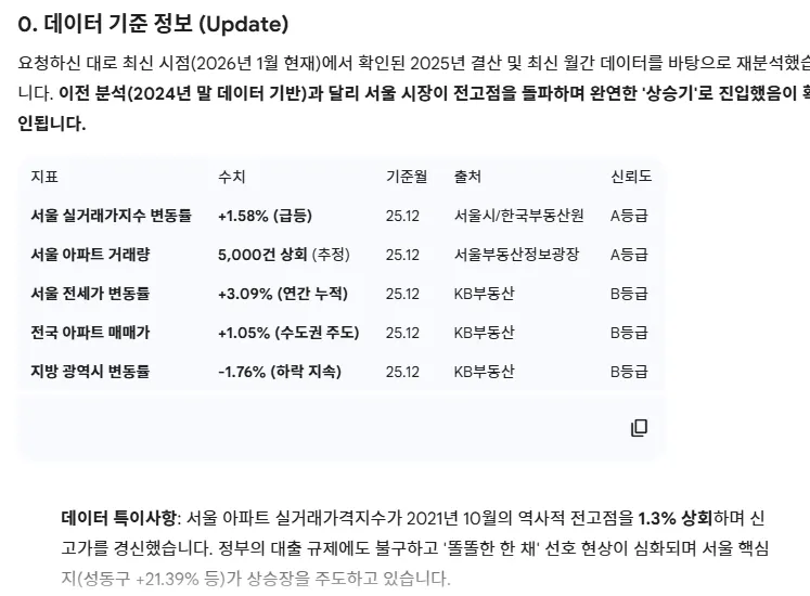 • 검토결과: 서울 매매가 변동률 기준 상이, Gemini(월간), Chatgpt(연간 누적, 주간), Claude(주간, 연간누적), Perplexity(월간, 주택종합)