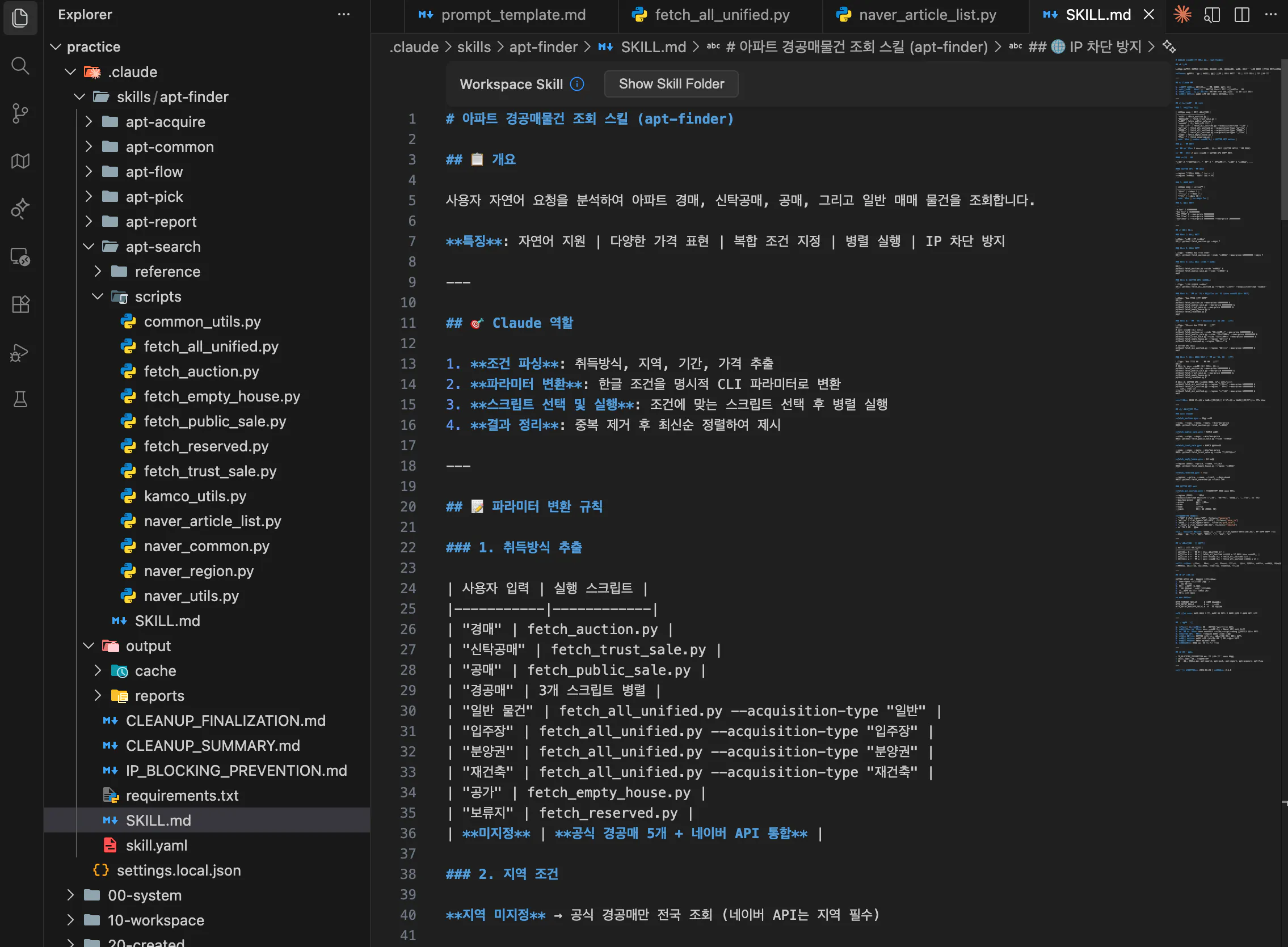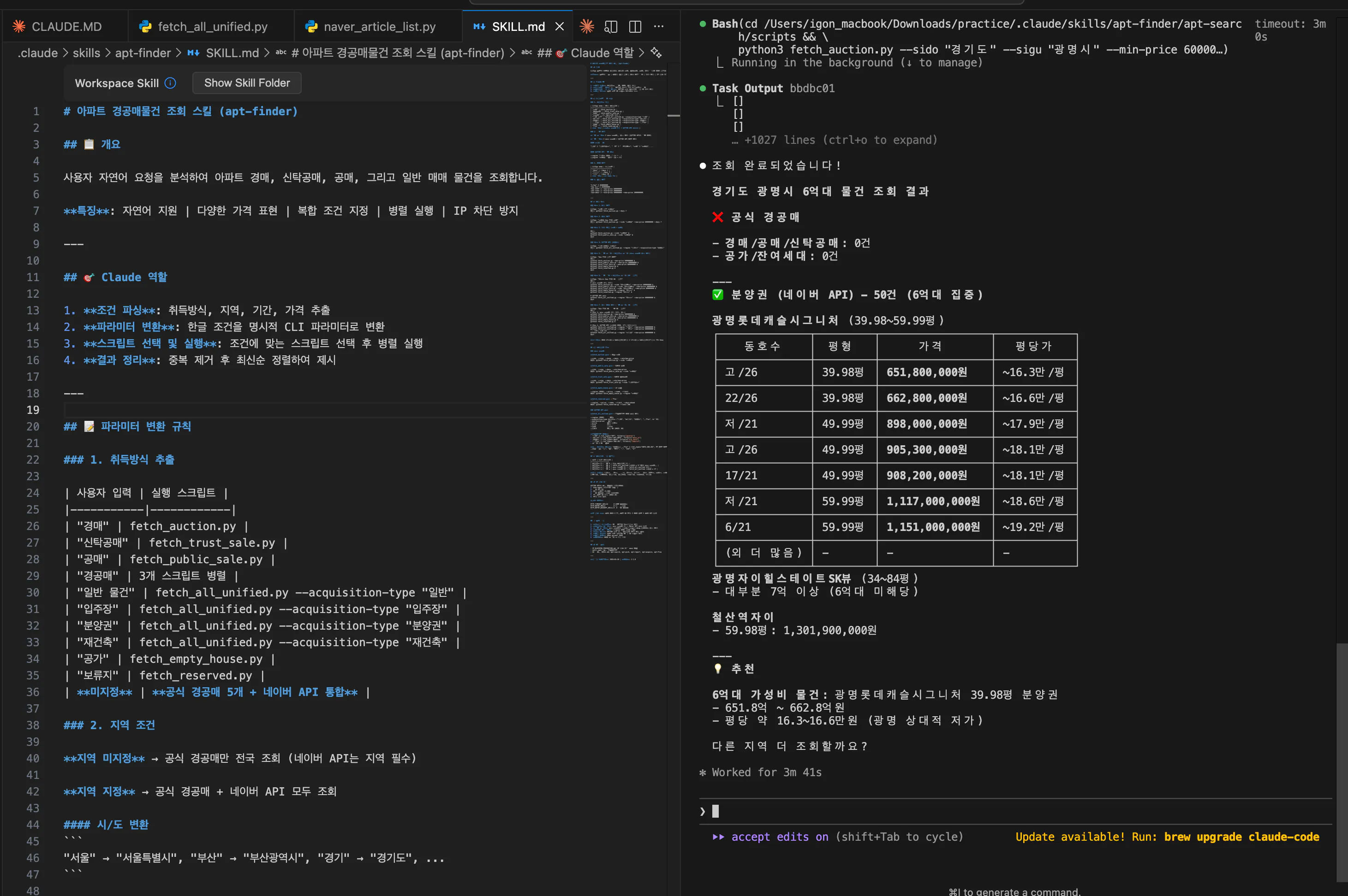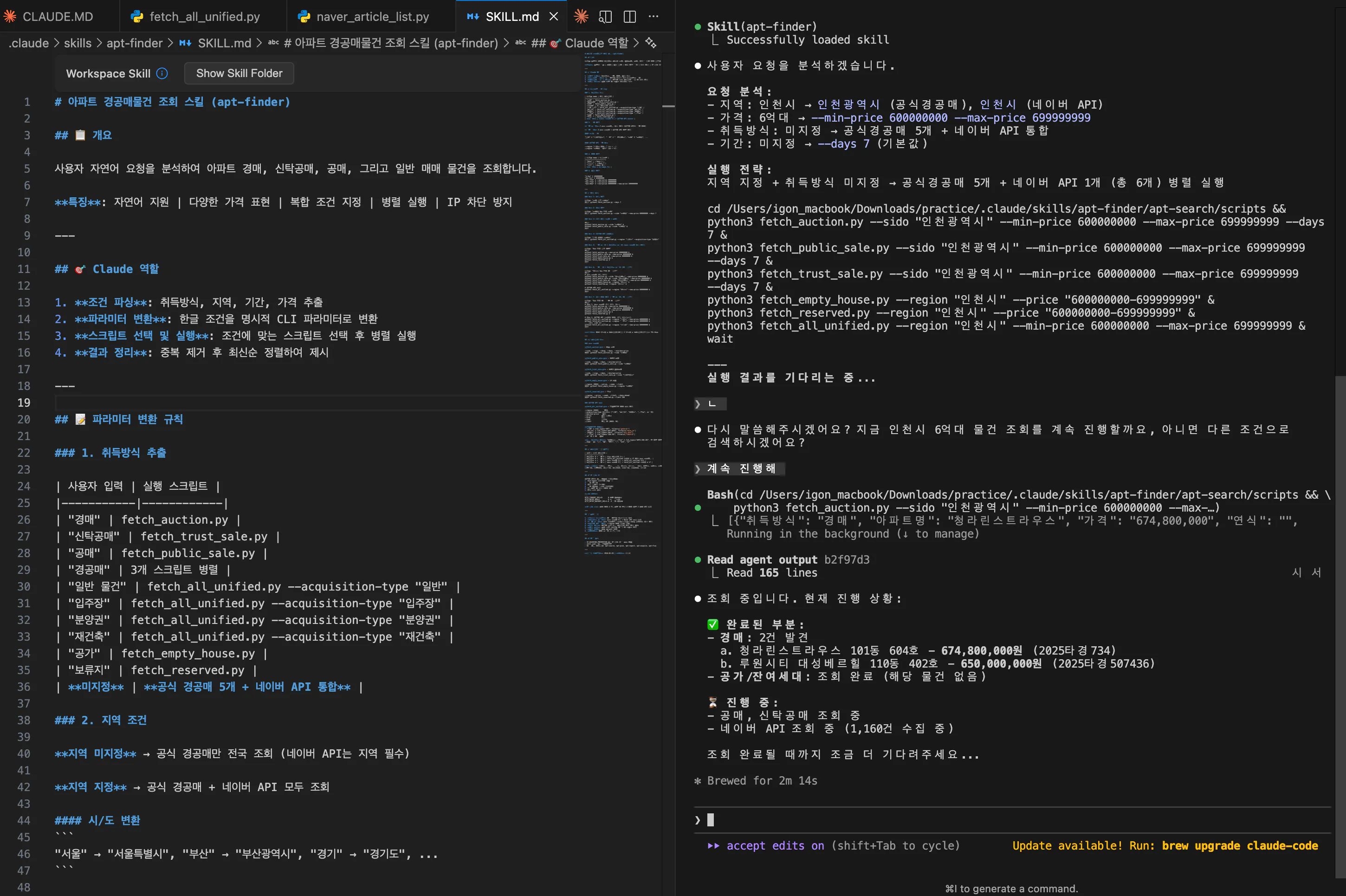 지난 번 신탁공매 물건을 취합하는 크롤링 로직을 작성하다가 부동산조 조장님들의 코멘트를 참고 받아서 API 형식으로 리스트를 받아오는 작업을 진행하고 있습니다. 여기에 더해서 경매, 공매, 분양권, 공가주택, 보류지까지 아파트를 취득할 수 있는 방법에 따른 매물 수집 로직을 작성하고 이를 스킬화 하여 클로드 코드에 이식하는 작업을 진행했습니다.