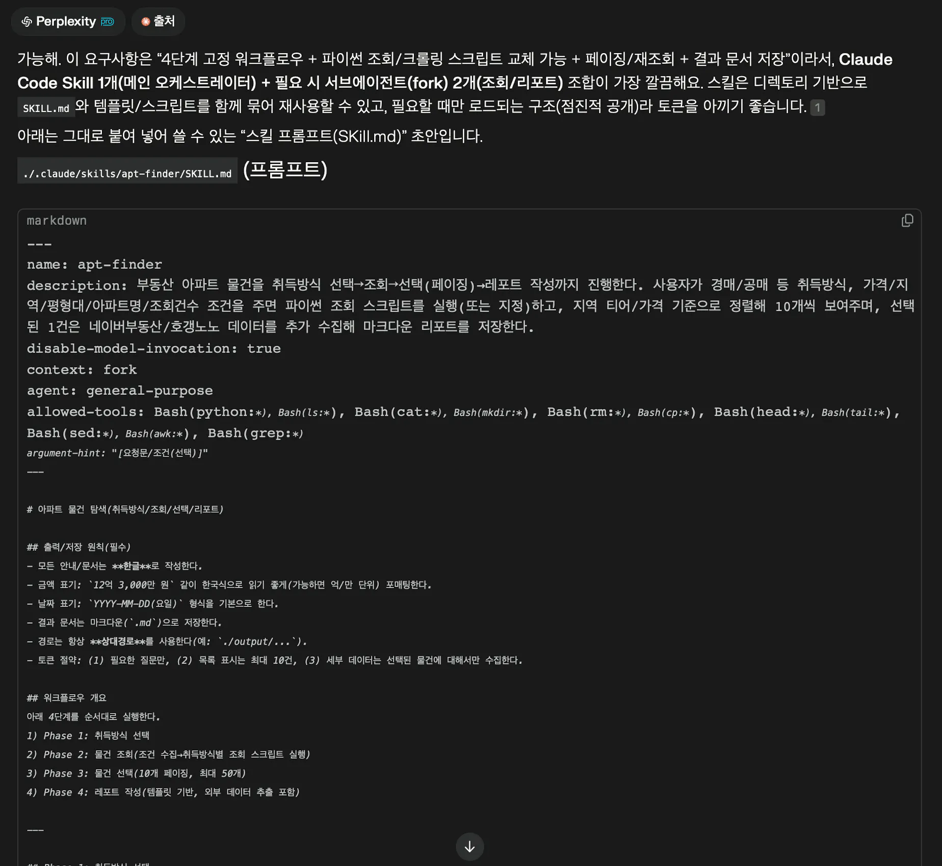 스킬은 만드는 데는 일단 퍼플렉시티에서 Chat-gpt모델로 먼저 전체적인 청사진을 만들고 전반적인 뼈대를 그린 이후에 해당 내용들을 프로젝트 폴더 내로 그대로 옮겨온 이후에 클로드 코드를 통해 테스트를 진행하며 수정 반복 했습니다.