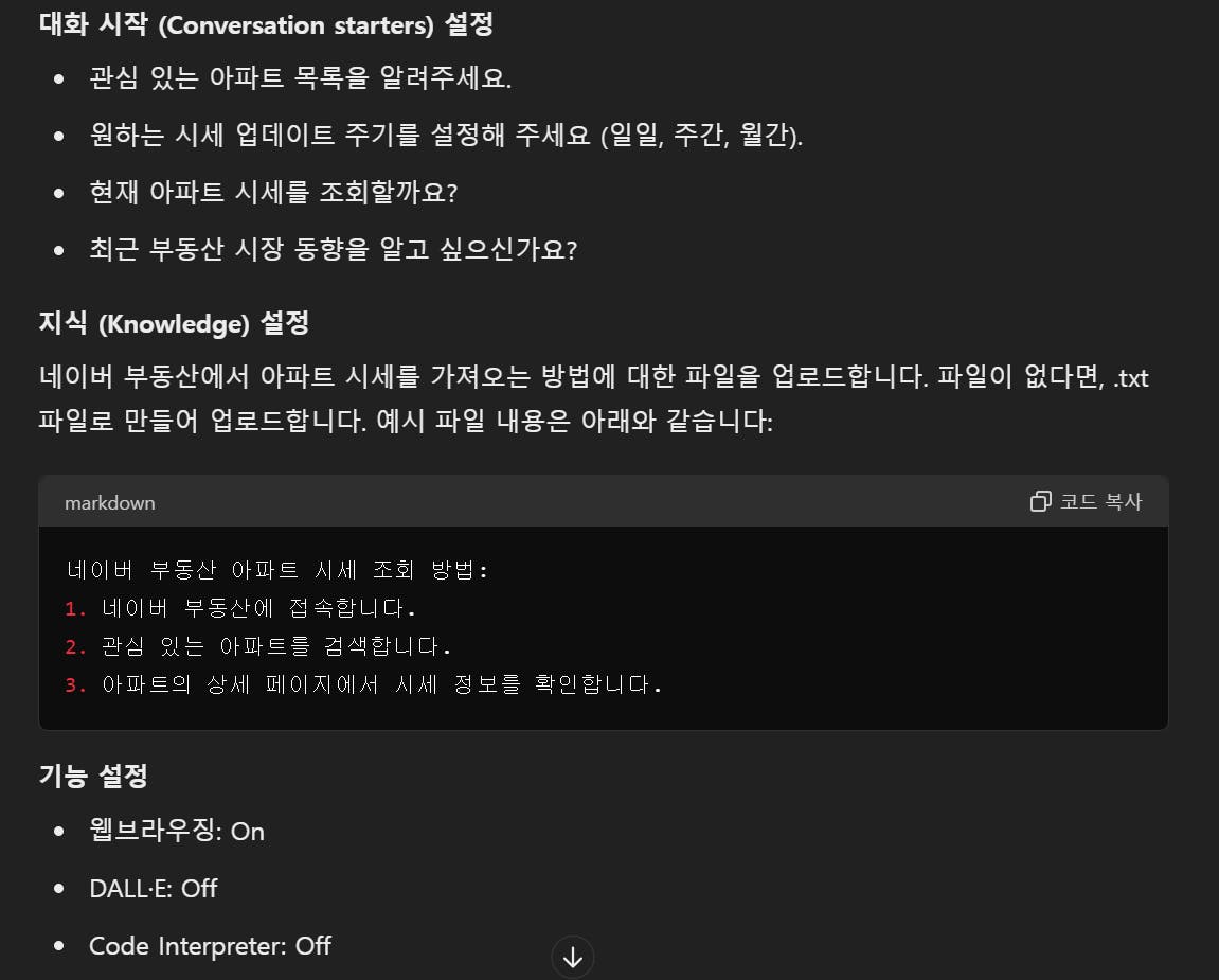 지식설정이 무슨 텍스트 파일로 해서 업로드하라는게 전부라서, 미씸적지만 일단 시키는대로 내용을 GPT에 다 넣어봅니다.