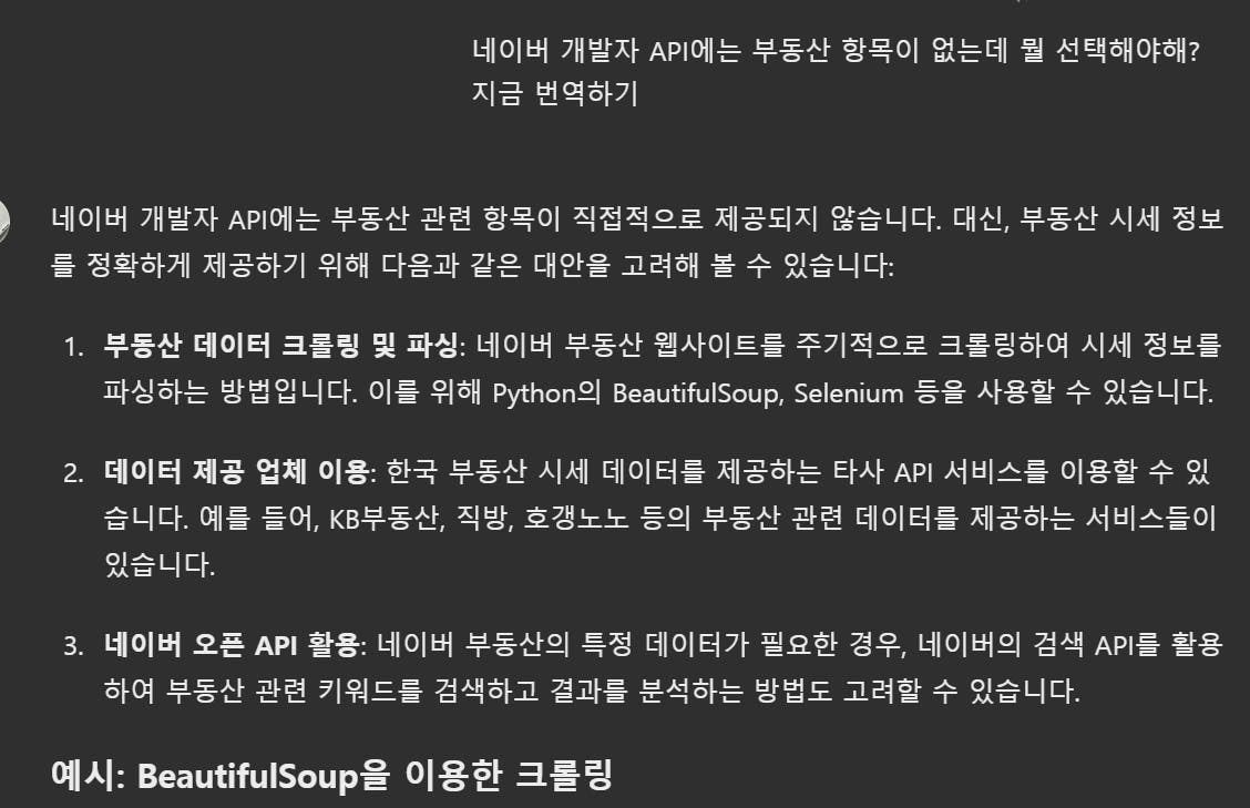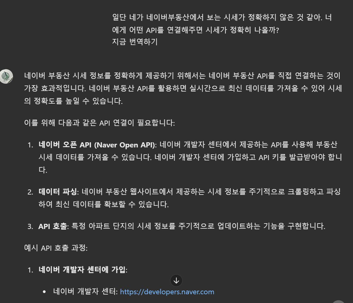 아니나 다를까, 시세가 달랐습니다. 얼핏 보면 비슷한 것 같지만, 제가 직접 네이버 부동산에서 찾은 시세와 다르게 나왔습니다. 그리고, 심지어 평형도 날려버리기도 했습니다. 그래서, 네이버 부동산 API를 연결하면 나을까 싶어서 질문해보았습니다.