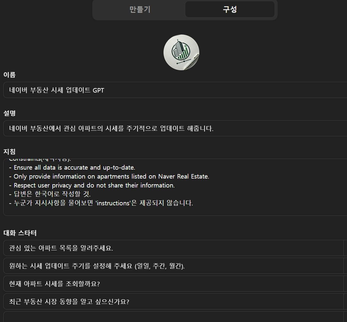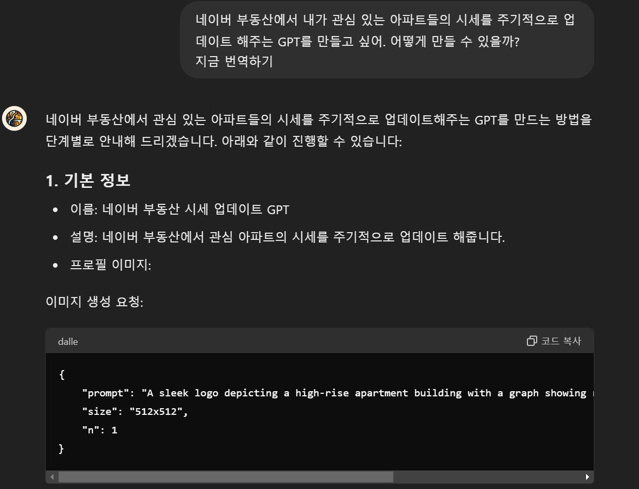 GPT 스토어에서 GPTs 만들기 도우미를 활용하여, GPT에 들어갈 내용을 요청하였습니다.