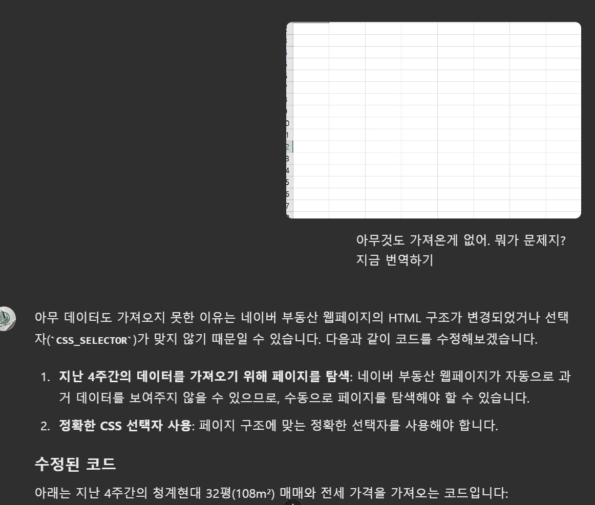 결국 파이썬 코드로 안내를 시작합니다. 하지만 계속 틀립니다 ㅠ 하다가 안되서 챗 GPT에서 만든 코드를 그대로 Gemini pro에게 가져가서 수정해달라고 합니다. 파일 생성까지는 되는데, 내용이 안나오네요 ㅠ