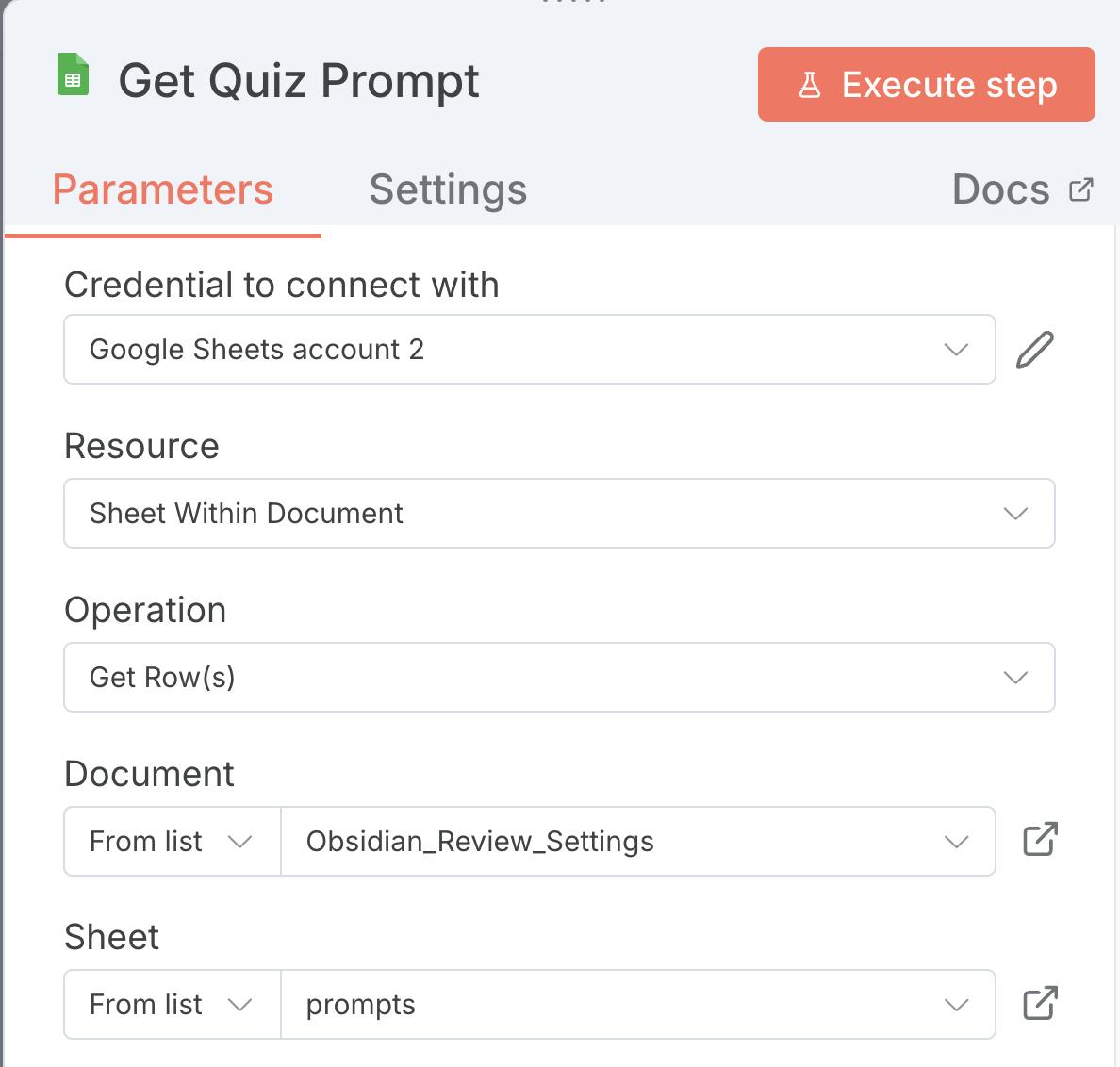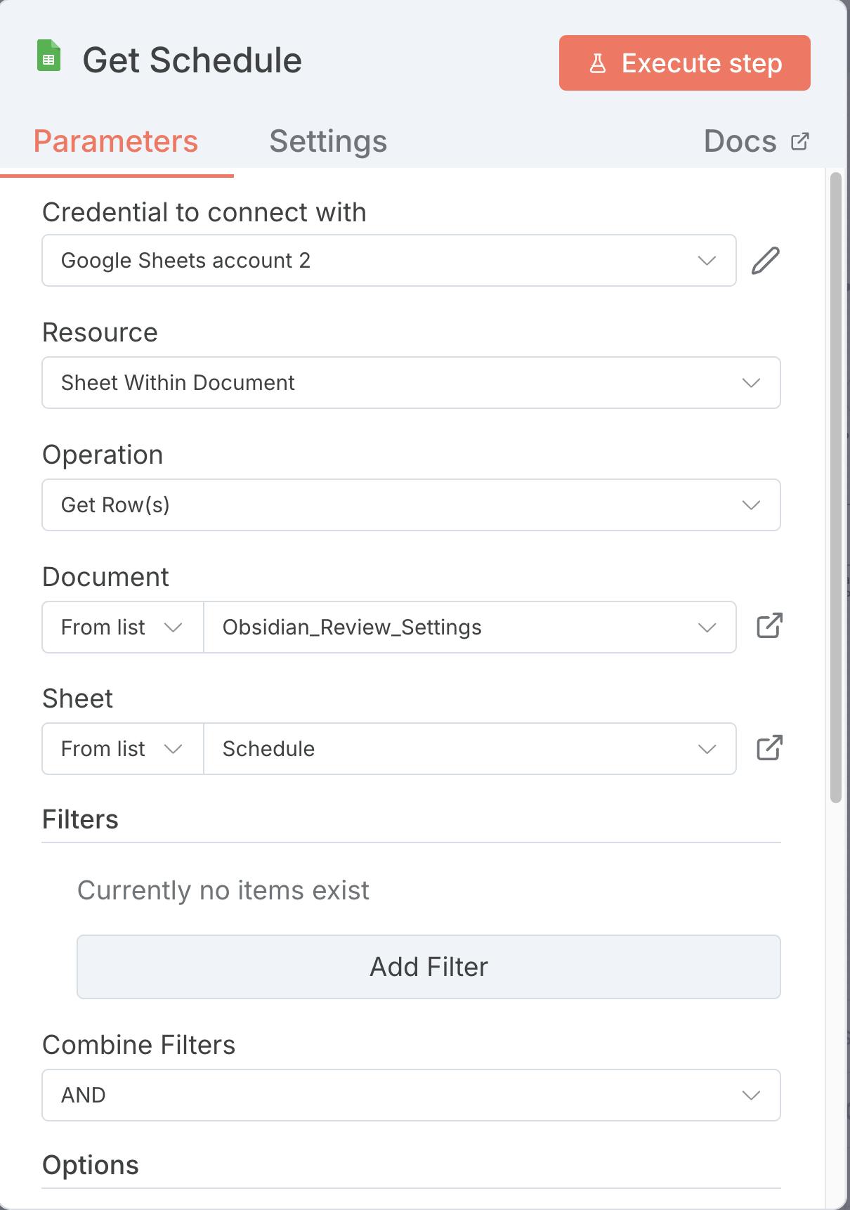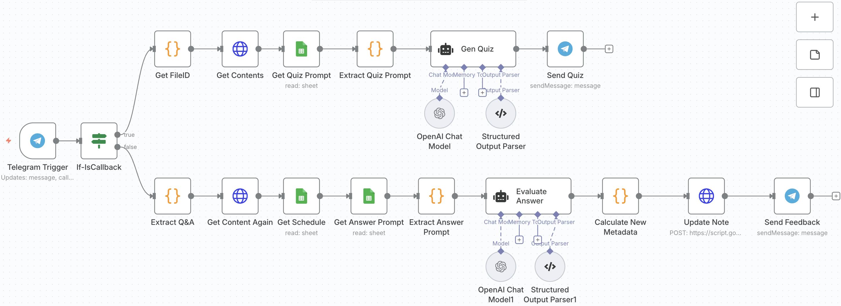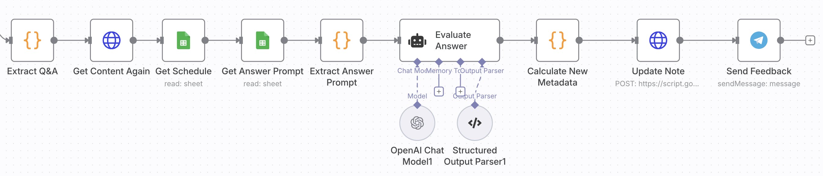 - **복습 스케줄 (`scheduleRows`):** `Get Schedule` 노드에서 복습 횟수와 그에 따른 복습 간격(분)이 정의된 데이터 배열을 가져옵니다.