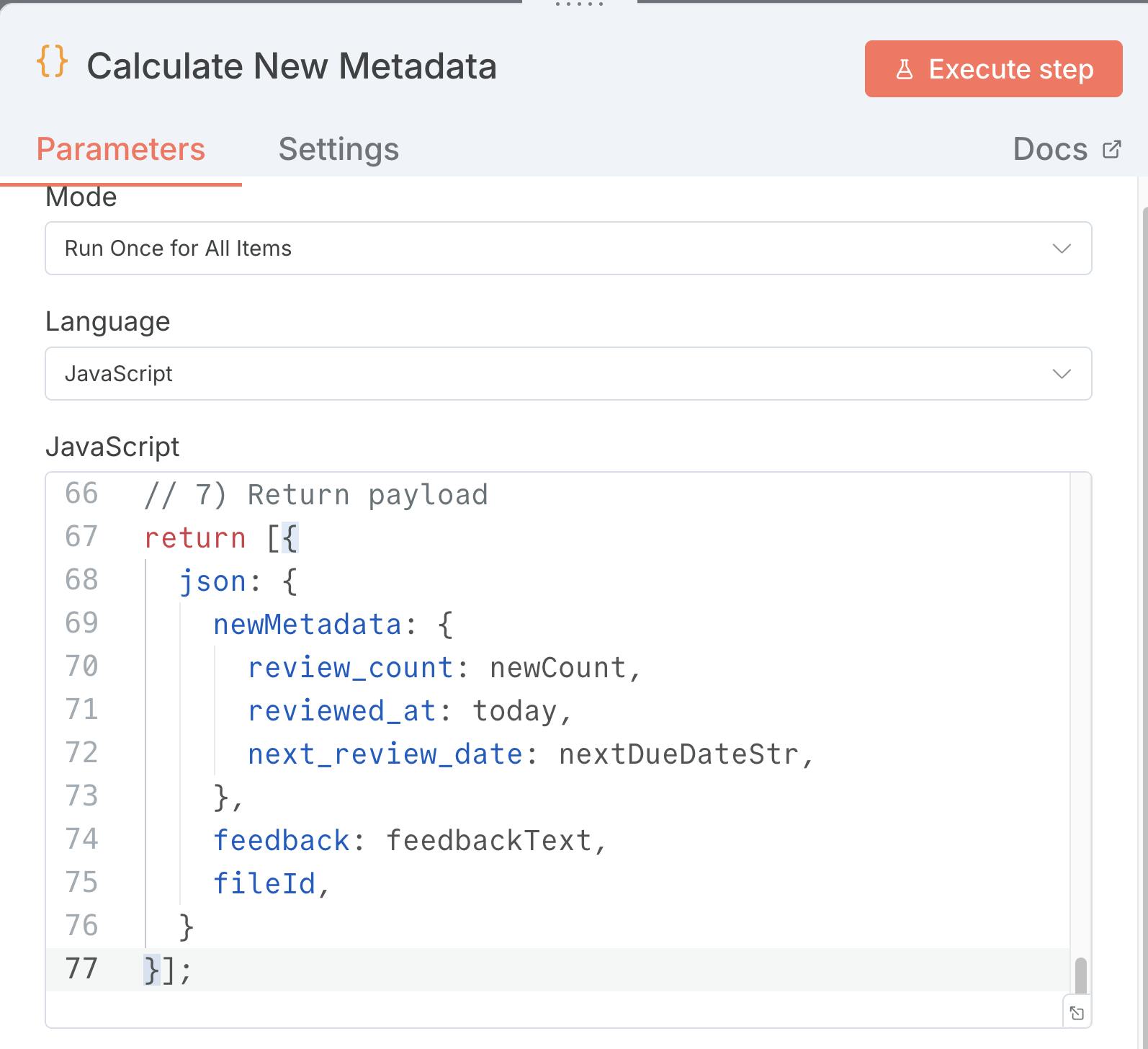 이 코드는 n8n 워크플로우 내에서 **간격 반복 학습(Spaced Repetition System, SRS) 로직을 실행**하는 핵심 부분입니다. AI의 평가 결과에 따라 노트 파일의 메타데이터(metadata)를 동적으로 계산하고, 다음 복습 일정을 결정하는 역할을 수행합니다.